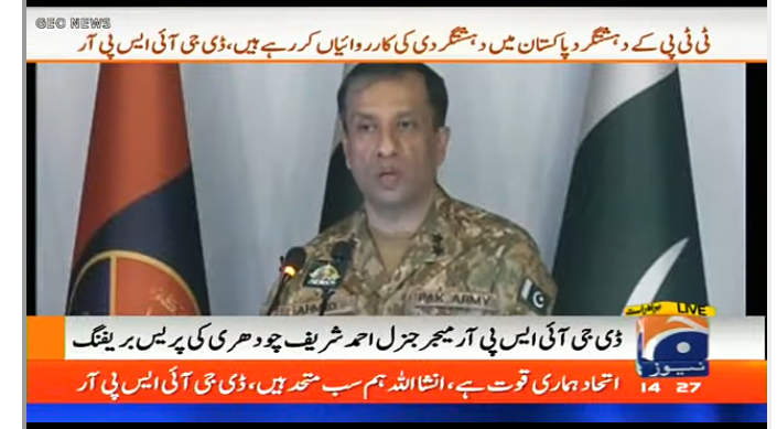 راولپنڈی میں پریس کانفرنس کرتے ہوئے میجر جنرل احمد شریف چوہدری نے کہا کہ خطے میں دہشتگردی کے خلاف سب سے اہم کردار پاکستان کا رہا ہے، پاکستان دہشتگردی کے نیٹ ورک کو ختم کرنے میں کوئی کسر نہیں چھوڑےگا، دہشتگردوں کے خلاف ہر ممکن حد تک جائیں گے، دہشتگردی جیسے ناسور کو جڑ سے اکھاڑ پھیکنے کو تیار ہیں۔
