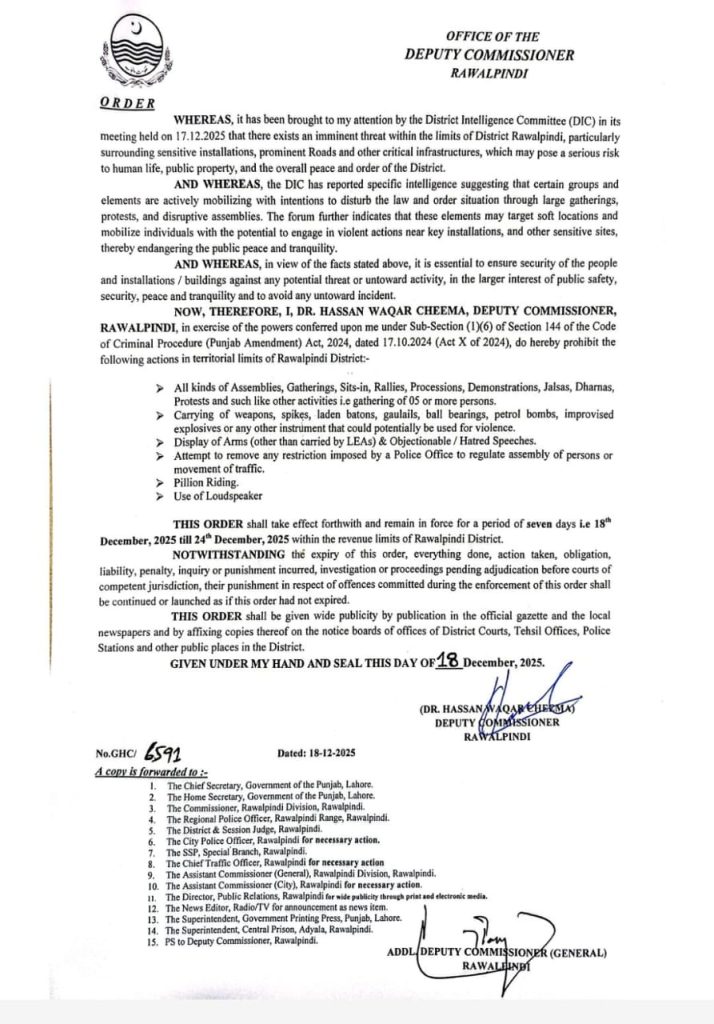 راولپنڈی (نیوز رپورٹر) راولپنڈی میں دفعہ 144 میں ایک بار پھر توسیع کردی گئی دفعہ 144 میں 24 دسمبر تک توسیع کردی گئی۔ ڈپٹی کمشنر راولپنڈی حسن وقار چیمہ نے نوٹیفکیشن جاری کردیا ۔ جس میں جلسے جلوس ریلیوں پر مکمل طور پابندی عائد کردی گئی ہے چار سے زیادہ افراد کے جمع ہونے پر پابندی عائدہوگی، لاؤڈ اسپیکر کے استعمال پر بھی پابندی عائد ہوگی