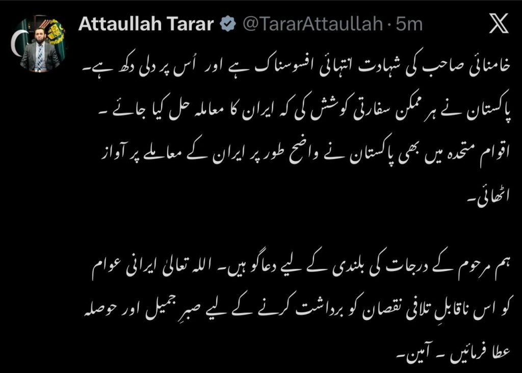 ادھر سابق وزیراعظم میاں نواز شریف کی بھی ایرانی حکومت اور عوام سے اظہار تعزیت کرتے ہوئے کہاکہ غم کی اس گھڑی میں ایرانی حکومت اور عوام کیساتھ شریک ہیں ۔ وزیر اطلاعات و نشریات عطاء اللہ تارڑ نے بھی تعزیتی پیغام میں آیت اللہ علی خامنہ ای کی شہادت کو بڑا نقصان قرار دیا ۔ ایرانی سفیر کی جانب سے حکومت، اپوزیشن، مذہبی رہنماؤں اور پاکستانی قوم سے اظہار تشکر کیا گیا۔
